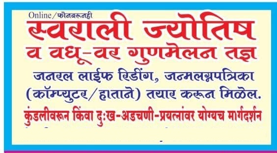 “स्वराली ज्योतिष व वधू वर गुणमेलन तज्ञ” ही सेवा फोनवरून किंवा प्रत्यक्ष मार्गदर्शक सेवा आहे. “स्वराली ज्योतिष” हे केवळ आपल्या जन्म तारीख, जन्म वेळ व जन्म ठिकाण यांच्या गणिती अभ्यासानुसारच […]